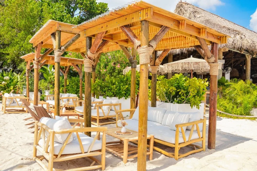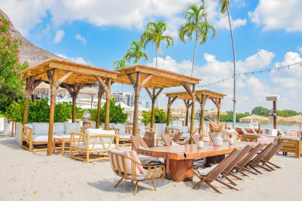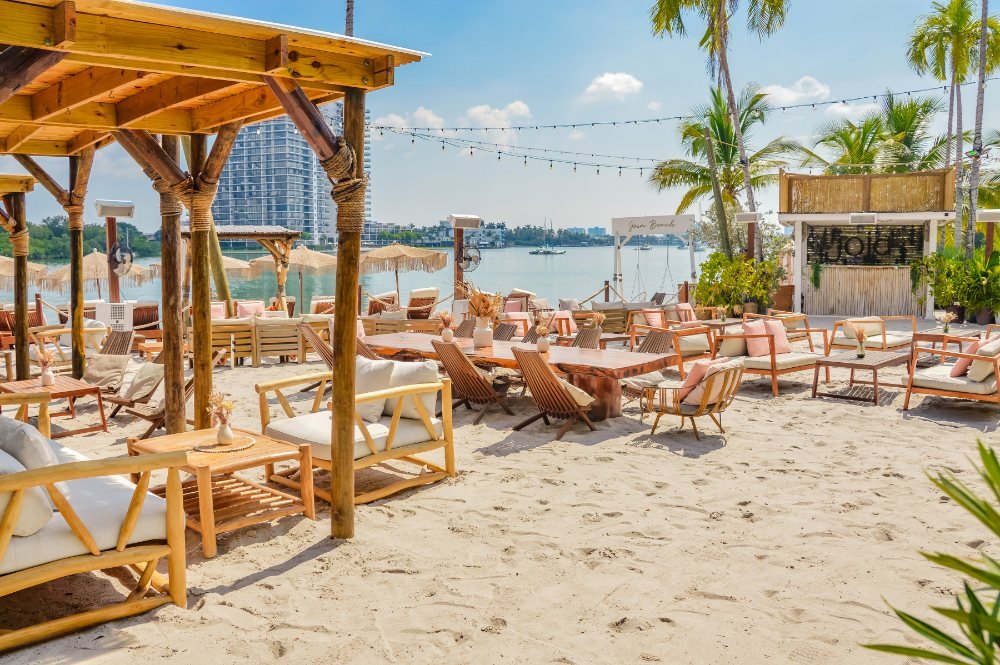 “an inspired outdoor lounge directly on the sand. here, guests are transported to the beauty of tulum, the spirit of mykonos, and the magic of the french riviera. oversized seating, sunset views, swaying palm trees, and ambient edison lighting make the lounge the perfect venue for groups of all sizes.”